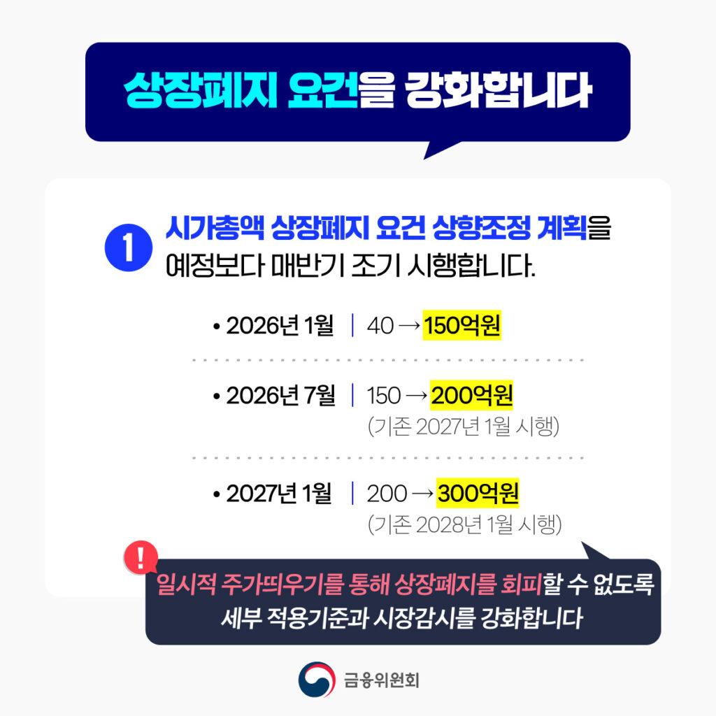 • 부실기업·좀비기업 신속 퇴출: 시가총액 상장폐지 기준 상향(2026년 7월 200억, 2027년 300억 등)과 부실 재무구조 기업 정리 가속.