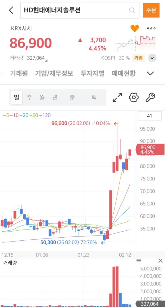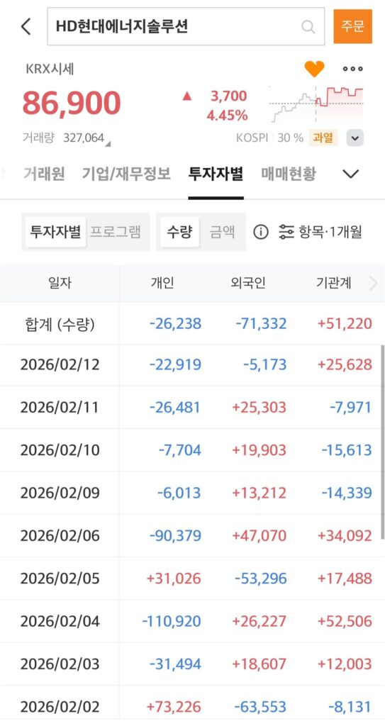 HD현대에너지솔루션은 2월3일부터 2월12일 오늘까지 꾸준히 외인, 기관의 양매수 혹은 단일매수로 수급이 들어왔고 현재는 3일간의 단일가매매에 걸려있는 상태입니다.